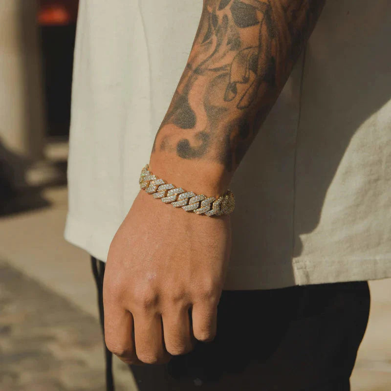 Procurando um bracelete que realmente o destaque? O link prong de 14mm é a resposta – é grande, ousado e repleto de pedras por toda parte. Inspirado pela corrente cubana, a corrente prong cria a imagem completamente nova que você está procurando.