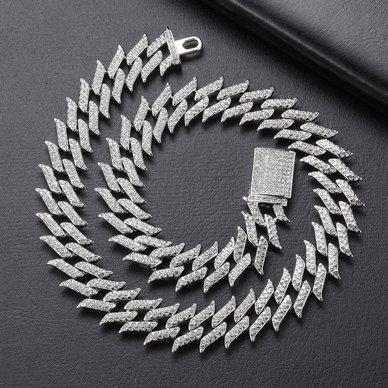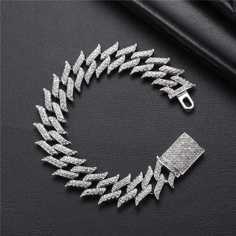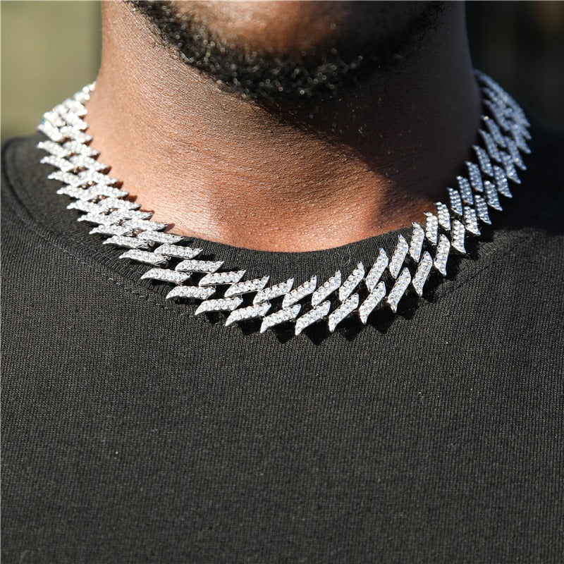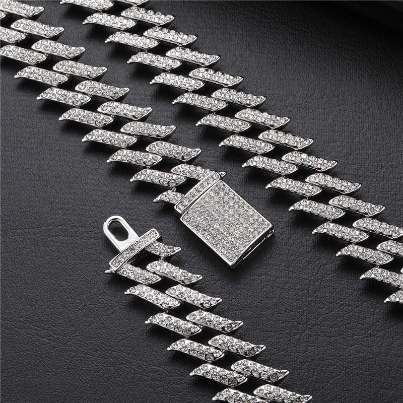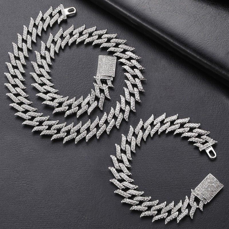 O Kit Cuban Flame (Ice Cravejado) 18mm traz um ar moderno ao clássico design da corrente Cuban. Este conjunto inclui uma corrente e uma pulseira, ambas cravejadas à mão com pedras de zircônia cúbica de qualidade AAA+, e com uma espessura robusta de 18mm.
